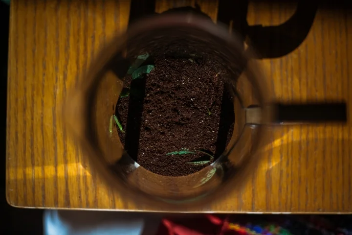 Pour some coffee onto the bottom of the french press...add some mint leaves on top...add another layer of coffee....add more mint leaves and stems and...you guessed it... more coffee.